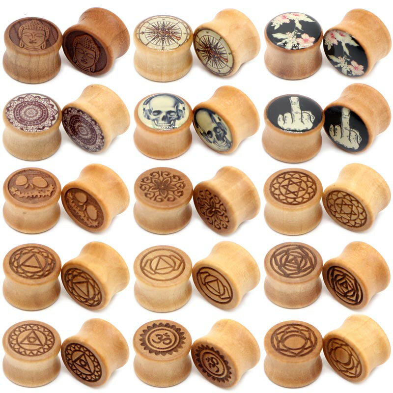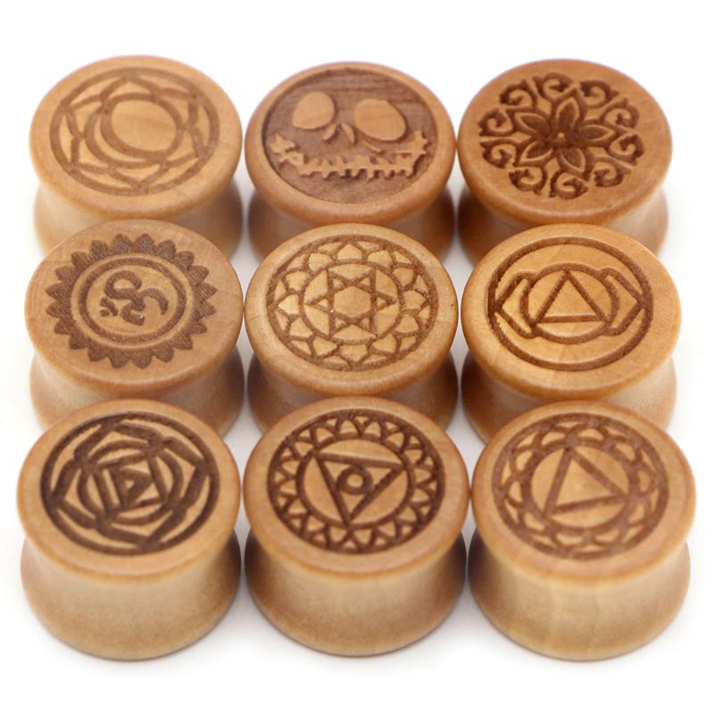 木製のベージュの木なり色の両側が広がったダブルフレアにブラフミー文字のボンジをデザインしたプラグ型ボディーピアス。