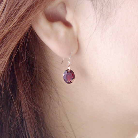 耳元でさりげなく揺れるのは、熟したフランボワーズのように色っぽい輝きの、存在感のある大きめガーネットの一粒ピアス。