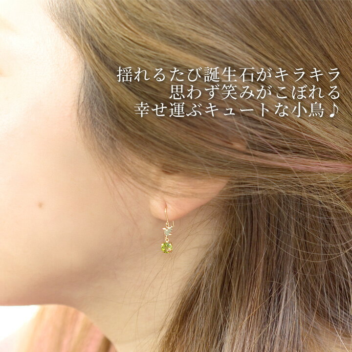 小鳥 チャーム 誕生石 フックピアス K10YG Detailサイズトップ:縦13mm×横5.5mm×厚み4mmポストの長さ:フックタイプ(ポスト径0.4mm)重さ:0.3g(片側)素材K10イエローゴールド(K10YG/10金)※ニッケルは含まれていないので、金属アレルギーが出にくい安心仕様です。