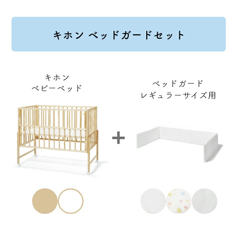 商品名 キホン ベビーベッド+ベッドガードレギュラーサイズセット サイズ 【ベビーベッド】約幅132×奥行77×高さ80・90・105cm【ベッドガード】約幅120×奥行き70×高さ23cm 厚み 2cm 床高サイズ 約幅120×奥行70cm 重量 約14kg(ベビーベッド) 対象年齢 新生児〜24カ月 素材 【ベビーベッド】パイン材・合板【ベッドガード】生地:やわらかワッフル 綿73% ポリエステル27% ほしのしずく・ひかりのしずく 綿100% 中綿:ウレタンフォーム 塗装 ウレタン樹脂塗装 仕様 組み立て式・スライド開閉式・キャスター付き 製造国 【ベビーベッド】インドネシア 【ベッドガード】日本 商品詳細 必要十分なものが、必要でした。