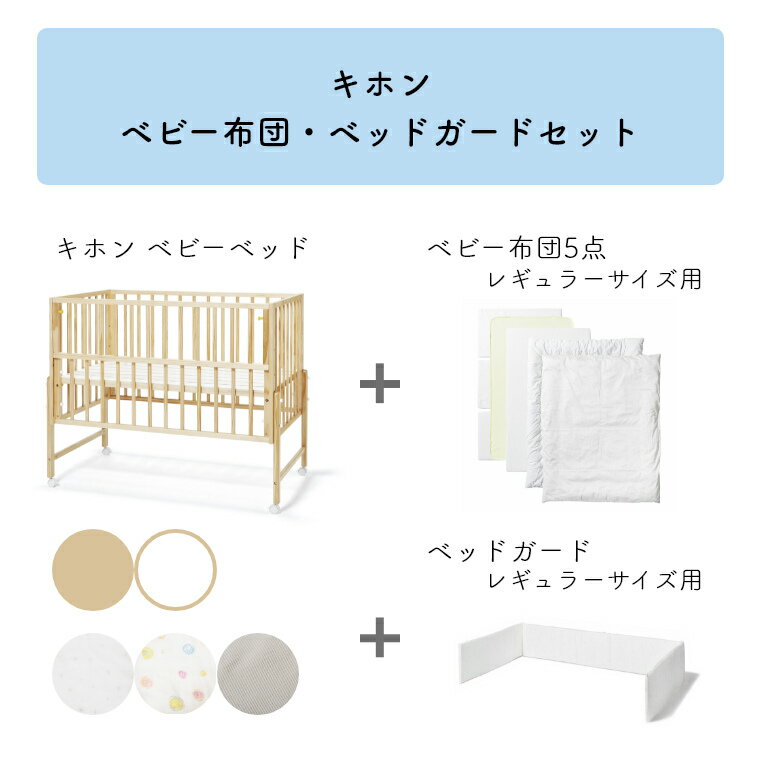 商品名 キホン ベビーベッド+ベビー布団・ベッドガードレギュラーサイズセット サイズ 【ベビーベッド】約幅132×奥行77×高さ80・90・105cm【ベビー布団】掛け布団:約100×125cm 掛け布団カバー:約105×130cm パイルフィットシーツ:約70×120cm 防水シーツ:約70×120cm 敷きマットレス:約70×40×5cm(3枚)【ベッドガード】約幅120×奥行き70×高さ23cm 厚み 約2cm 床高サイズ 約幅120×奥行70cm 重量 約14kg(ベビーベッド) 対象年齢 新生児〜24カ月 素材 【ベビーベッド】パイン材・合板【ベビー布団】・掛け布団カバー やわらかワッフル:表/綿73% ポリエステル27% 裏/綿100% ほしのしずく・ひかりのしずく:綿100% ・掛け布団 生地:綿100% 中綿:キルト綿 ポリエステル100% ・防水シーツ 表:綿80% ポリエステル20% 裏:ウレタン樹脂フィルム ・パイルフィットシーツ 生地:綿80% ポリエステル20% ・敷きマットレス 生地:綿100% 中綿:ポリエステル100%【ベッドガード】生地:やわらかワッフル 綿73% ポリエステル27% ほしのしずく・ひかりのしずく 綿100% 中綿:ウレタンフォーム 塗装 ウレタン樹脂塗装 仕様 組み立て式・スライド開閉式・キャスター付き 製造国 【ベビーベッド】インドネシア 【ベビー布団・ベッドガード】日本 商品詳細 必要十分なものが、必要でした。
