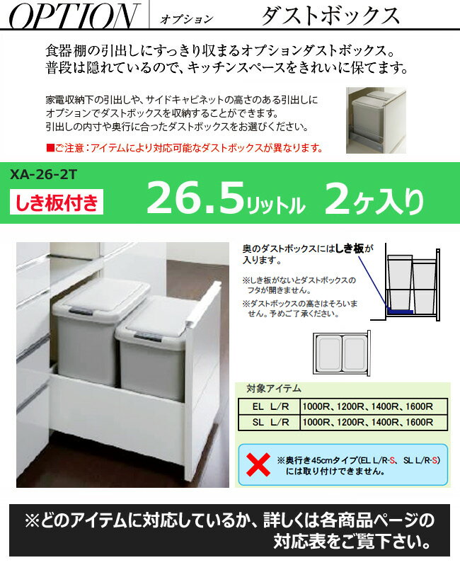 商品仕様 素材・カラー パモウナ XA-26-2T 【しき板付き/ダストボックス/26.5リットル/2ヶ入り】 サイズ 各W232×D368×H440 重量 備考 パモウナ 【しき板付き/ダストボックス/26.5リットル/2ヶ入り】XA-26-2T EL/SL 26.5L オプション 関連 送料 送料無料 納期 約1週間 ※正確な納期につきましては、お買い上げ後にメールさせていただきます。