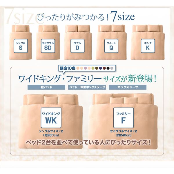 商品内容リピーター続出!80,000人が愛用中!20色コットンタオルシリーズボックスシーツに特大サイズ(ワイドキング・ファミリーサイズ)新登場!ザブザブ洗えて気持ちいい!コットンタオルのパッド・シーツ まとめ買いがお得!!20色×7サイズ コットンタオル パッド・シーツさっと敷くだけで さらさら快適!コットン100%のタオル素材!インテリアに合わせて選べる! 20 COLOR暮らしに合わせて選べる! 4 TYPE敷パッドパッド一体型ボックスシーツボックスシーツ和式用和式用フィットシーツぴったりがみつかる! 7 SIZEシングルセミダブルダブルクイーンキング限定10色!敷パッド パッド一体型ボックスシーツ ボックスシーツに新登場!ワイドキング(シングルサイズ×2 約200cm)ファミリーサイズ(セミダブルサイズ×2 約240cm)ベッド2台を並べて使っている人にぴったりサイズ!コットンタオルのパッド・シーツ人気のひみつ 1汗をかいてもサラサラ快適!きめ細かなパイルは暑い季節には汗や湿気を吸い取ってくれて、べたつかず、さらさら快適。