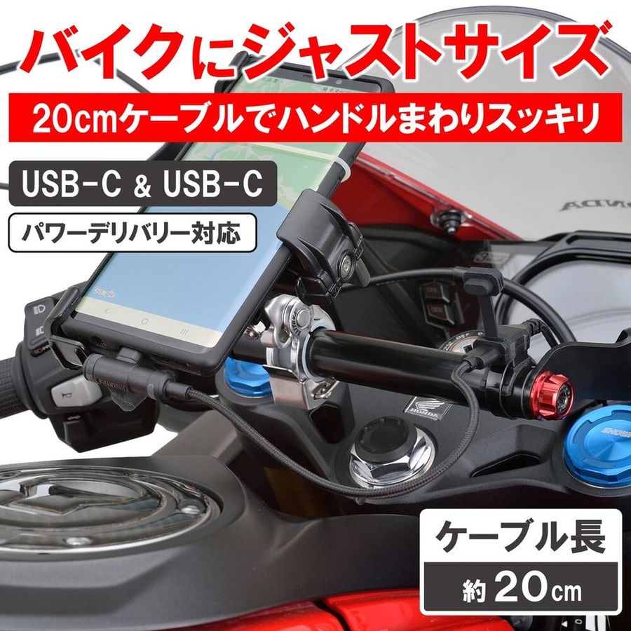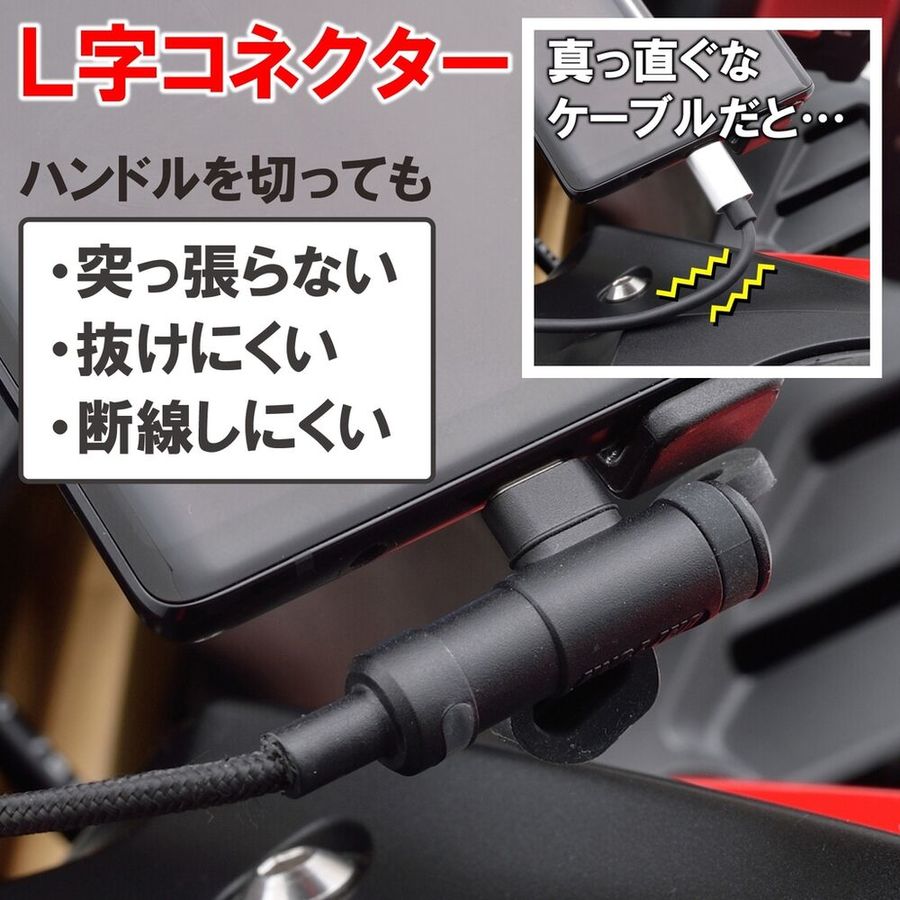 ■商品概要【仕様】・USB-C & USB-C・L字コネクター・20cmケーブル・急速充電対応・Android対応■詳細説明【L字コネクター】張り出しの少ないコンパクトなL字コネクターを採用することで、ハンドルを切った時のケーブルの突っ張りや断線を抑止します。