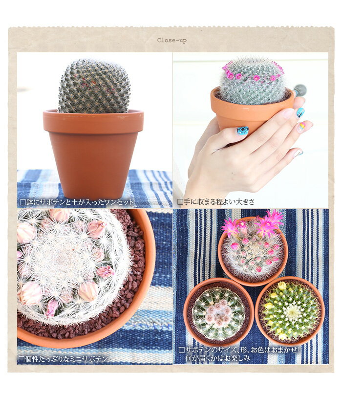 中には花を咲かせる子も! お部屋の模様替えや、一人暮らしのお部屋にも!プレゼントにもおすすめです! 育て方 ・サボテンは日当たりのいい場所に置き、雨にあてない ・土が乾いたら適度に水やりをしてください ・風通しのいい場所で育ててください 注意点 ※ご注文から3-7日後の配送予定です。