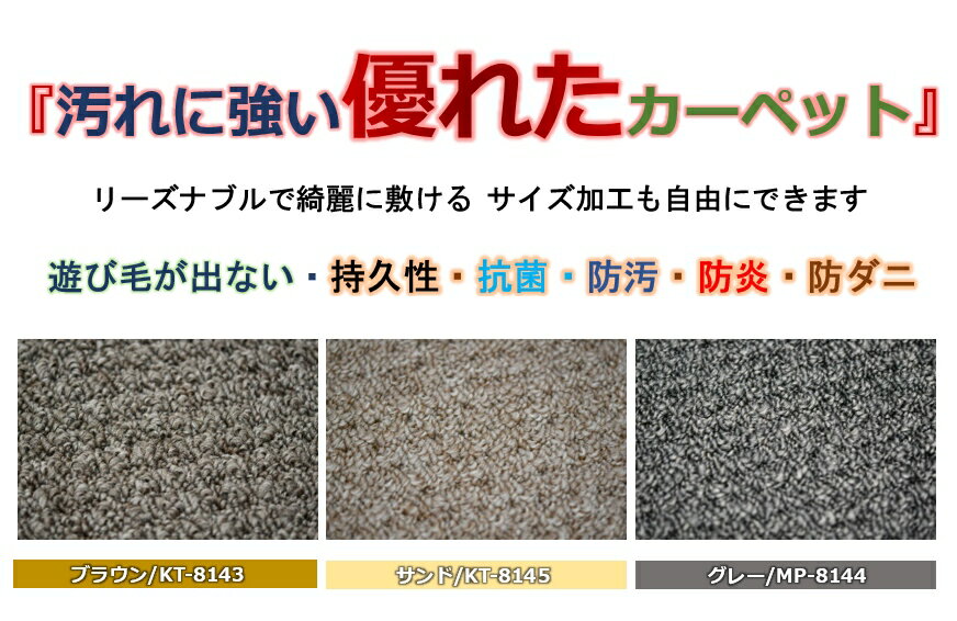 )日本製 防炎 防汚 防ダニ 防虫 カーペット 【NEW クルテク】 6畳 261×352cm 特 徴 原産国:日本製 Made in Japan 素 材:表:ポリプロピレン100% 裏:麻貼り 毛 足:5.5mm 全厚約7.4mm 毛足形状:ループ 機 能:防炎 防ダニ 防虫 防汚 制電 抗菌 遊び毛なし ホットカーペット/床暖房対応、フリーカットOK どんなお部屋にも合わせやすいベーシックな丸巻きカーペットは糸の量が価格以上に目付され、お掃除もしやすく超高機能 防炎 防汚 抗菌 防ダニ 制電 遊び毛防止 国産だから安心安全! ●カーペットの縁取りは(オーバーロック 4辺)同色糸で縫ってあります。